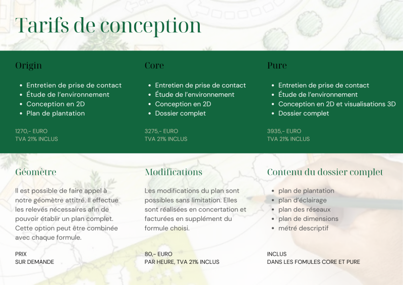 Dans un premier temps vous pouvez nous contacter pour la conception de votre jardin, après quoi nous serons heureux de vous aider dans la réalisation de tout espace extérieur et jardin!